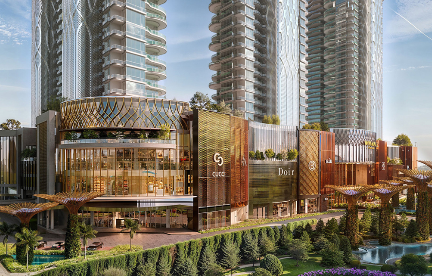 Features luxury brands, fine dining, jewelry, and entertainment zones.